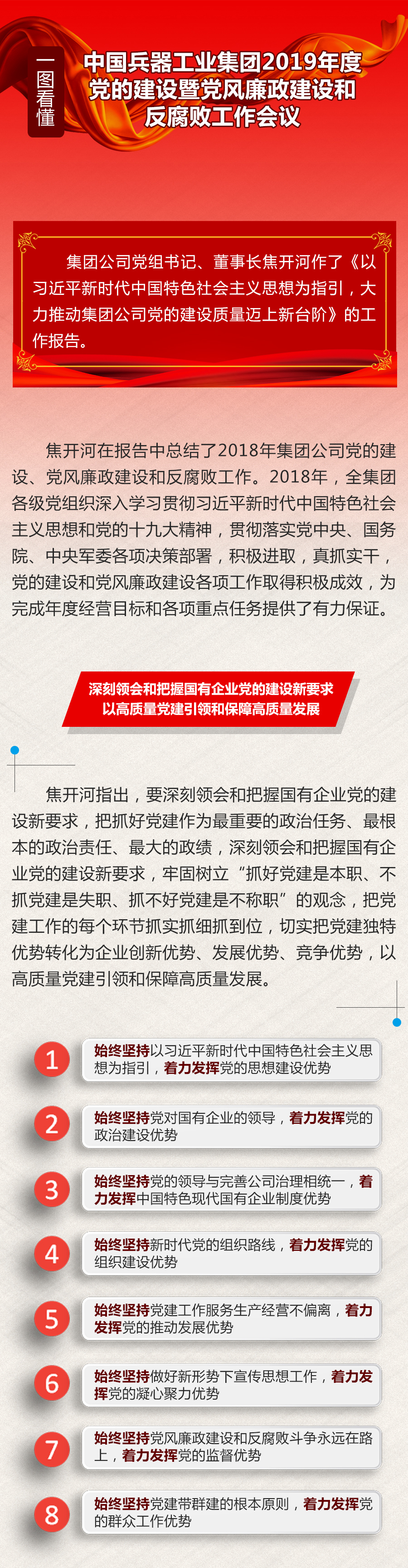 焦開河對2019年黨的建設、黨風廉政建設和反腐敗工作作了部署。2019年集團公司黨建工作總的要求是:以習近平新時代中國特色社會主義思想為指導,全面貫徹落實黨的十九大和十九屆二中、三中全會精神,堅決貫徹落實黨中央、國務院、中央軍委各項決策部署,緊緊圍繞新時代黨的建設總要求和黨的組織路線,以黨的政治建設為統領,以建強黨的組織體系為重點,以提高經營效益、增強競爭力為出發點和落腳點,著力推進中國特色現代國有企業制度建設,著力加強高素質專業化干部人才隊伍建設,著力深化基本組織基本隊伍基本制度“三基建設”,著力推動宣傳思想工作守正創新,著力加強和改進群團統戰工作,著力把黨風廉政建設和反腐敗工作引向深入,以高質量黨建引領和保障高質量發展,以優異成績向新中國成立70周年獻禮。一是強化創新理論武裝,持之以恒學懂弄通做實習近平新時代中國特色社會主義思想。二是著力健全完善制度機制,發揮黨組(黨委)把方向、管大局、保落實的領導作用。三是貫徹落實新時代黨的組織路線,打造忠誠干凈擔當的干部隊伍和開放融合創新的人才隊伍。四是突出政治功能和組織力,推動基層黨建全面進步全面過硬。五是圍繞慶祝新中國成立70周年主線,守正創新開展好宣傳思想工作。六是堅持穩中求進,推動黨風廉政建設和反腐敗工作向縱深發展。七是堅持黨建帶群建,不斷增進群團工作的政治性、先進性、群眾性。