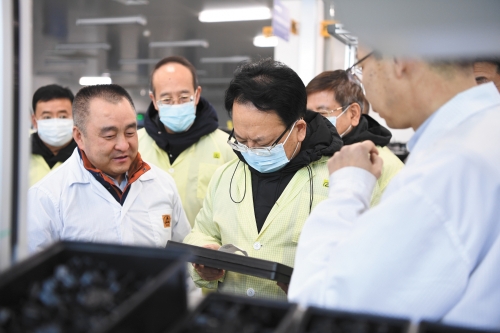12月9日,吉林省委書記景俊海到中國兵器工業集團東北工業集團有限公司,就深入貫徹黨的十九屆五中全會精神和習近平總書記視察吉林重要講話重要指示精神,全面落實省委十一屆八次全會精神,推動企業創新發展等情況進行調研。吉林省委常委、副省長吳靖平,吉林省委常委、省委秘書長胡家福,吉林省委常委、長春市委書記王凱一同調研。  圖為景俊海等在東北工業集團生產現場調研