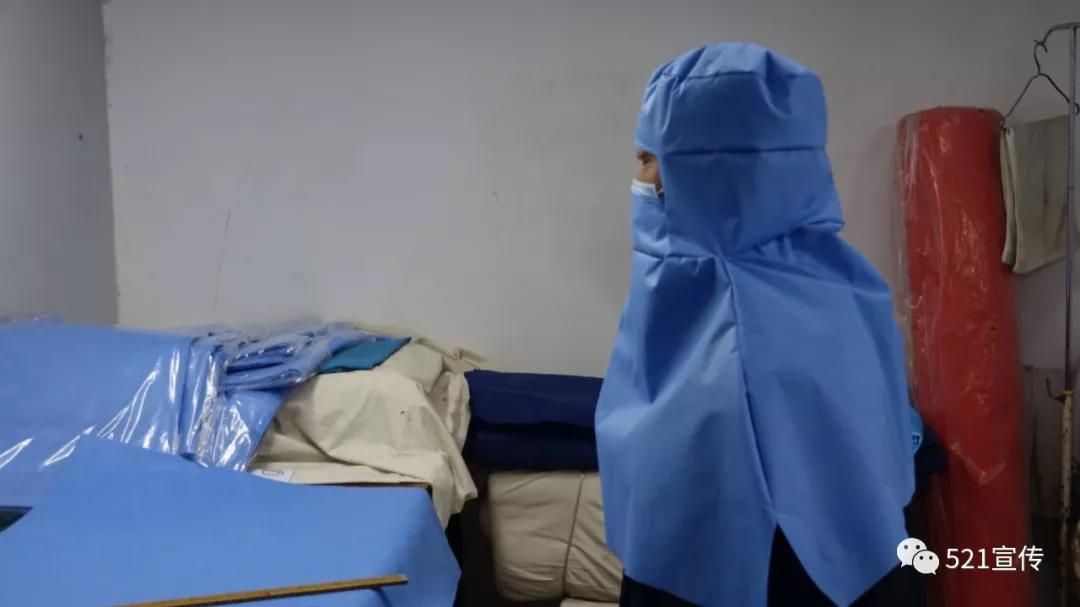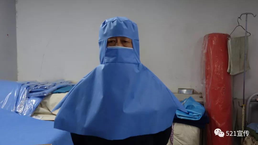 1月30日晚,后勤保障處張小林、聶鳳芝等立即忙碌起來,從設計、剪裁再到縫紉都是“純手工原創”,很快醫用防護所使用的頭套就加工出來。經醫院疫情防控指揮部人員驗收,防護頭套適用性很強,基本可以滿足防護需要。指揮部要求連夜加工20套,送至一線,聽取大家意見、再修改,定型后大批量加工配至一線。為盡快提供給一線試戴,張小林、聶鳳芝等同志一夜未眠,20套防護頭套第二天一大早就交付到了一線醫護人員手中。