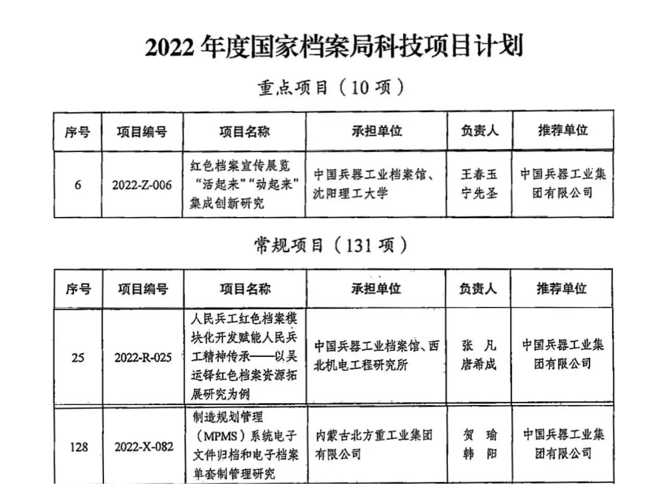 為深入貫徹落實《“十四五”全國檔案事業(yè)發(fā)展規(guī)劃》要求,著力提升檔案科研自主創(chuàng)新能力,根據(jù)《國家檔案局辦公室關(guān)于開展2022年度國家檔案局科技項目立項工作的通知》要求,中國兵器工業(yè)集團檔案館(以下簡稱檔案館)依據(jù)《2022年科技項目立項選題指南》,組織各單位申報成功三個檔案科技項目在國家檔案局立項,其中一個項目為國家級10項重點項目之一,排名第六,這是繼2021年在國家檔案局首次立項三個項目后的又一重大突破,標志著兵器工業(yè)檔案科研工作邁上新臺階。