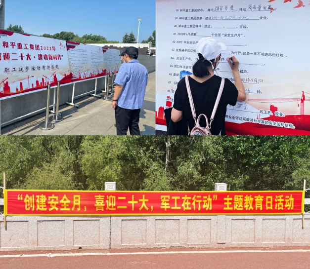 和平重工集團在安全生產月期間組織開展了“創建安全月 喜迎二十大 軍工在行動”主題教育日活動,現場懸掛宣傳橫幅標語,工作人員為職工們發放安全知識宣傳冊、扇子等宣傳用品,并在現場組織了安全知識有獎答題環節,調動廣大職工參與的積極性,大力營造了“關愛生命、關注安全”的良好氛圍。